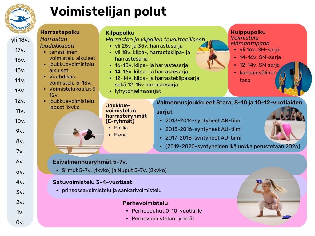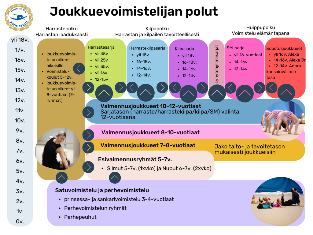 Joukkuevoimistelussa kilpailevia joukkueita on 8-vuotiaista ylöspäin. Joukkuevoimistelua on mahdollista harrastaa eri sarjatasoilla lapsesta aikuisuuteen. Valintavaiheen (12v.) jälkeen lajia voi harrastaa harraste-, kilpa- ja SM-sarjoissa, minkä lisäksi tarjolla on lyhytohjelmasarja (short). Seurassamme on kolme polkua: