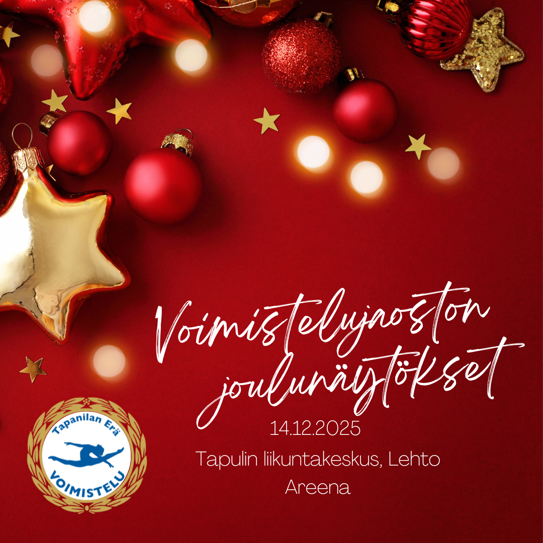 Tapanilan Erän Voimistelujaoston joulunäytös järjestetään sunnuntaina 14.12.2025 Tapulin liikuntakeskuksessa Lehto Areenalla. Järjestämme kaksi näytöstä, jotta kaikki halukkaat pääsevät näkemään esitykset. Näytöksissä esiintyvät lähes kaikki jaoston esiintyvät ja kilpailevat joukkueet. Jokaiseen näytökseen sisältyy lyhyt väliaika.