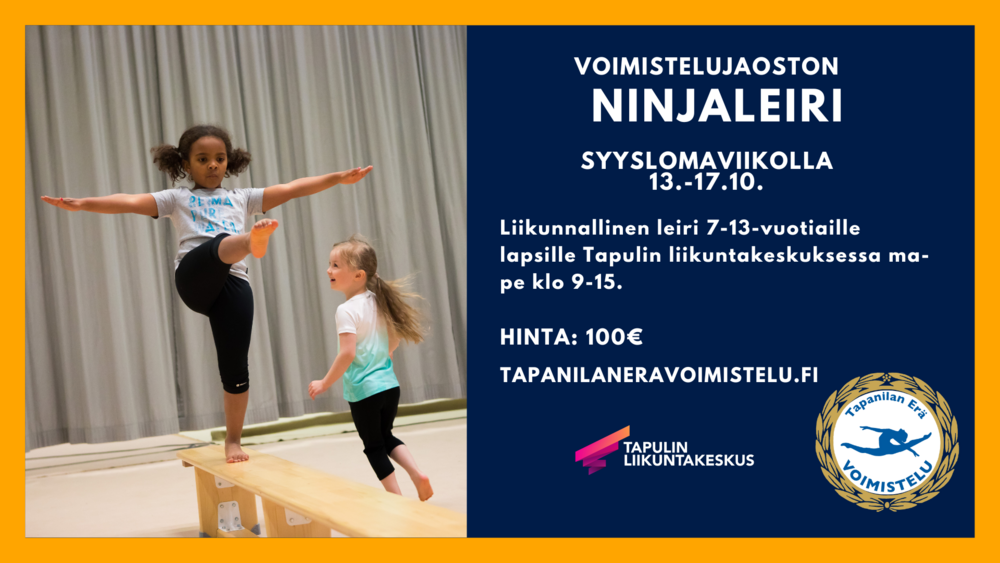 Tapanilan Erän Voimistelujaosto järjestää syyslomaviikolla (13.-17.10.2025) ninjaleirin noin 7-13-vuotiaille lapsille. Leirillä liikutaan monipuolisesti Tapulin liikuntakeskuksessa ja sen lähiympäristössä. Pääpaino on voimistelussa, akrobatiassa, peleissä, leikeissä ja perusliikuntataidoissa. Leirillä ulkoillaan monipuolisesti. Leirin aikana tutustutaan myös muihin lajeihin Tapanilan Erän tai muiden seurojen valikoimasta. Leiri sopii kaikille temppuilusta innostuneille; osallistuminen ei edellytä voimistelutaustaa tai voimisteluryhmiin kuulumista.