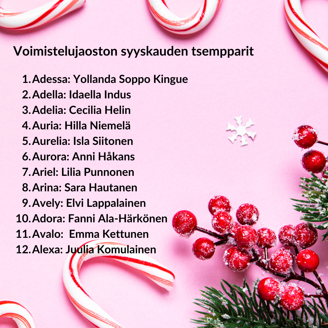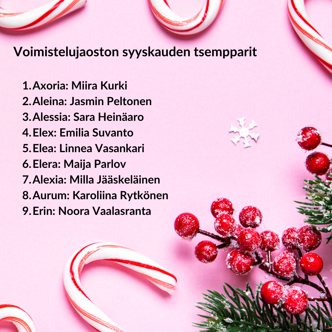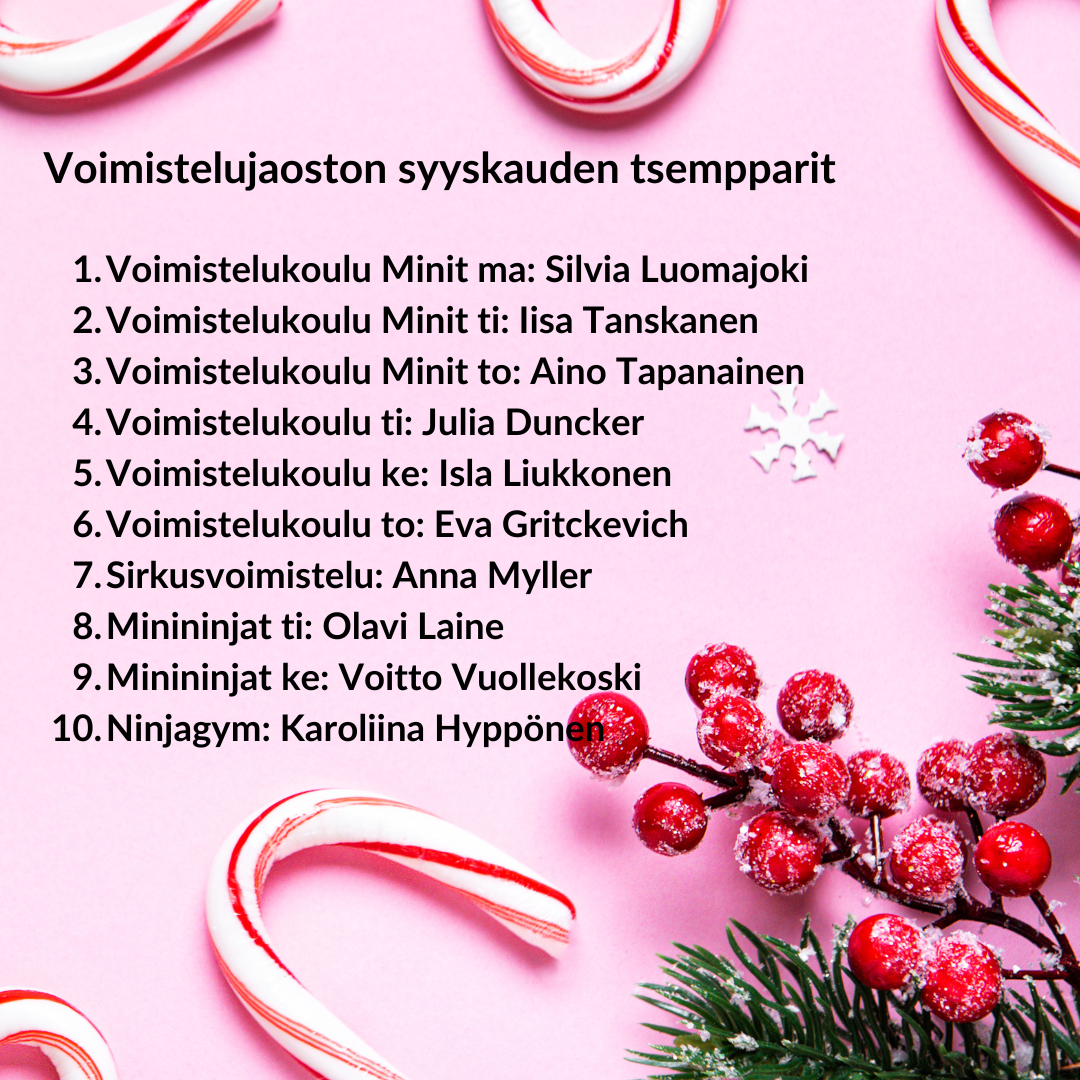 Voimistelujaoston harrasteryhmien syyskausi päättyi 14.12.2025. Valmennusjoukkueet harjoittelevat vielä koulujen päättymiseen asti. Joulutauon jälkeen voimistelun pariin päästään tammikuussa. Järjestämme Eräriehan kaikille jäsenillemme 2.1. klo 16-19:30 Tapulin liikuntakeskuksessa ja sen ympäristössä. Tervetuloa viettämään aikaa perheen kanssa yhdessä liikkuen ja leikkien!