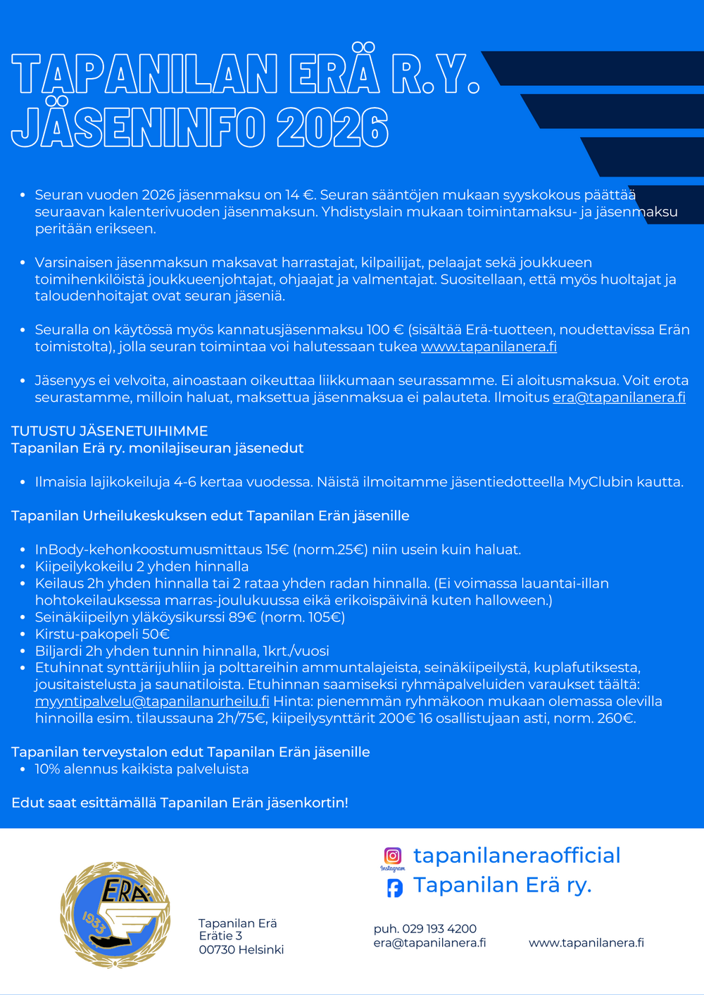 Tapanilan Erän jäsenenä olet oikeutettu seuraaviin jäsenetuihin.